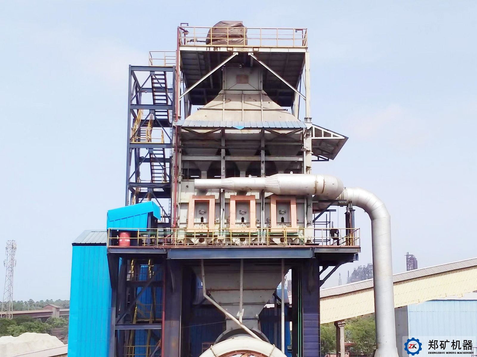 豎式預(yù)熱器和豎式冷卻機為河南鄭礦機器專利技術(shù)產(chǎn)品,具有入窯物料預(yù)熱效率高和出窯石灰冷卻效率高等特點,產(chǎn)品單耗底、節(jié)能,節(jié)省場地面積。石灰活性高,白度好,均勻穩(wěn)定。窯尾出預(yù)熱器廢氣采用機力空冷機,大幅降低入收塵器廢氣溫度,同時布袋收塵器入口加裝冷風(fēng)口,做應(yīng)急使用,防止異常情況下高溫氣體燒壞收塵濾袋。